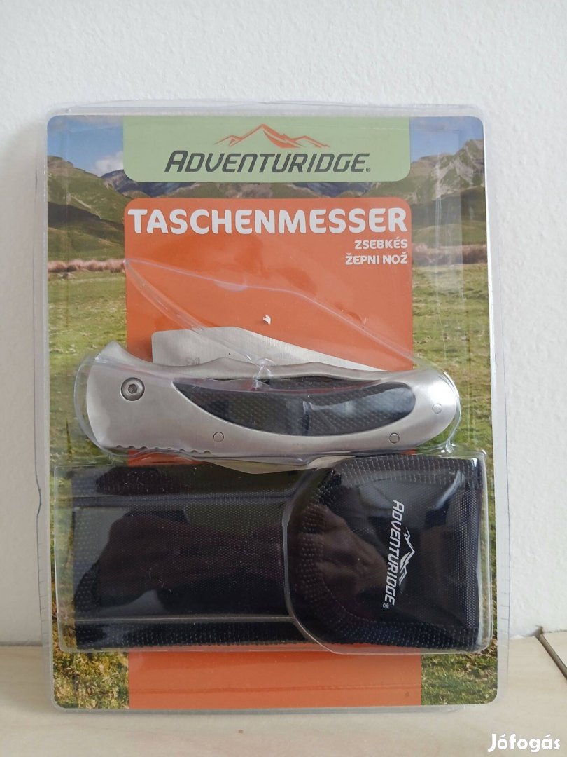 Adventuridge összecsukható zsebkés, rozsdamentes, nagyon éles, fém nyéllel. Övre akasztható tartóval. Ideális kiránduláshoz.