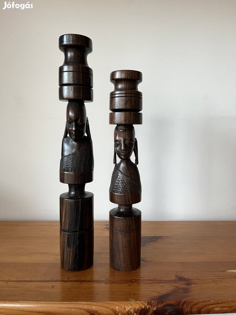 Afrikai faragott ébenfa szobor gyertyatartó pár
