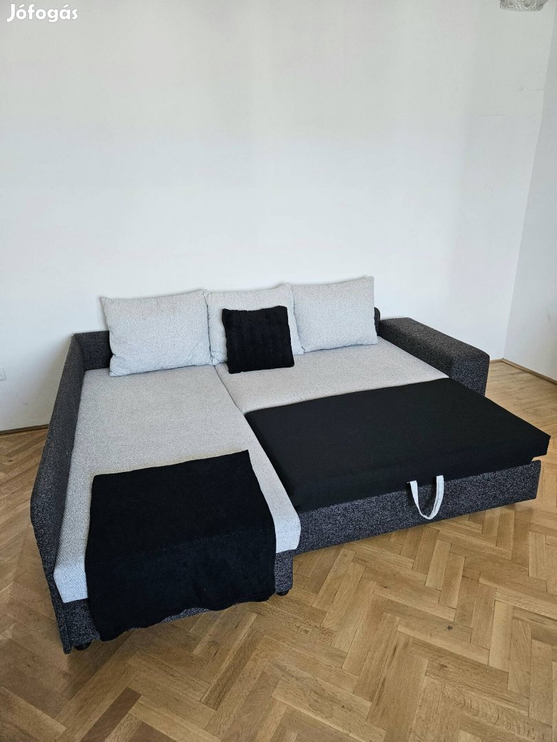 Fekete - szürke ágyazható sarokkananapé ágyneműtartóval.