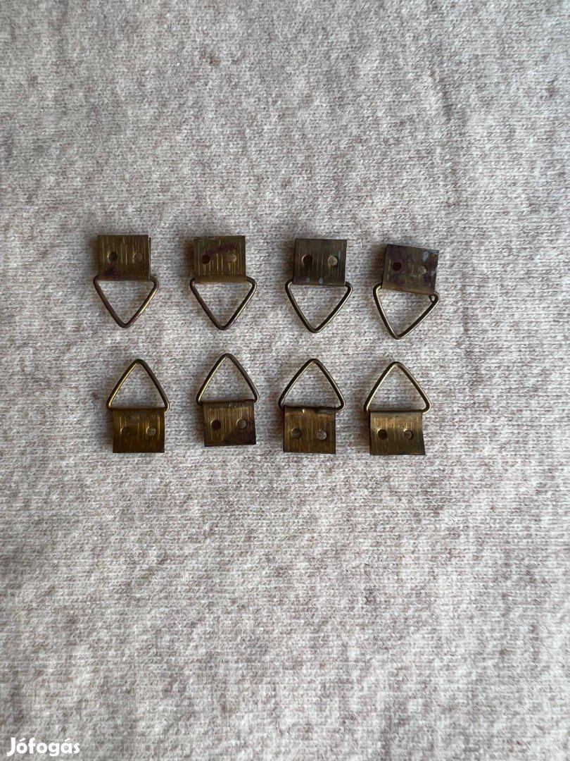 Műhelymunkából kimaradt, új kiváló minőségű akasztó eladó. Jó teherbírású, még nehéz keretek esetében is. Az erős felfüggesztés gondoskodik arról, hogy a keret biztosan lógjon és egyenes legyen. Anyaga kiváló minőségű, erős acél, amely sárgarezezett. A felületi kezelés révén dekoratív, arany szín jött létre. A csomag 8 darabot tartalmaz.