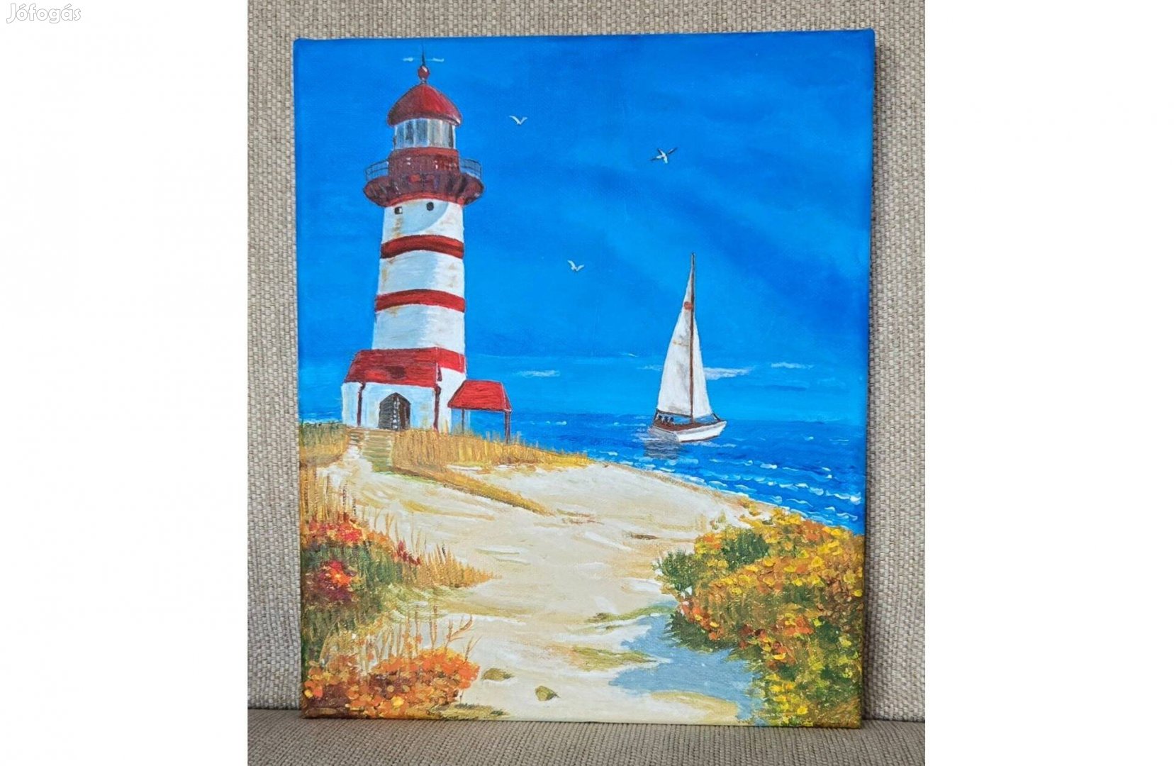 25 × 30 cm-es, kézzel festett akrilkép vásznon. Világítótorony és vitorlás a mélykék tenger előtt, nyugodt, napfényes atmoszférával. A homok részletei különösen gondosan, profi módon kidolgozottak, természetes hatást keltve. Ideális választás nappaliba, nyaralóba vagy ajándéknak.