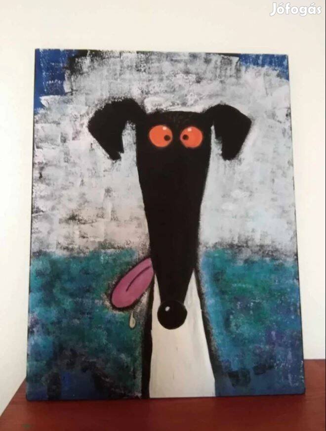 Akril kép, festmény - bohém stílusban- Alfonzról, a kissé retardált verseny agárról.