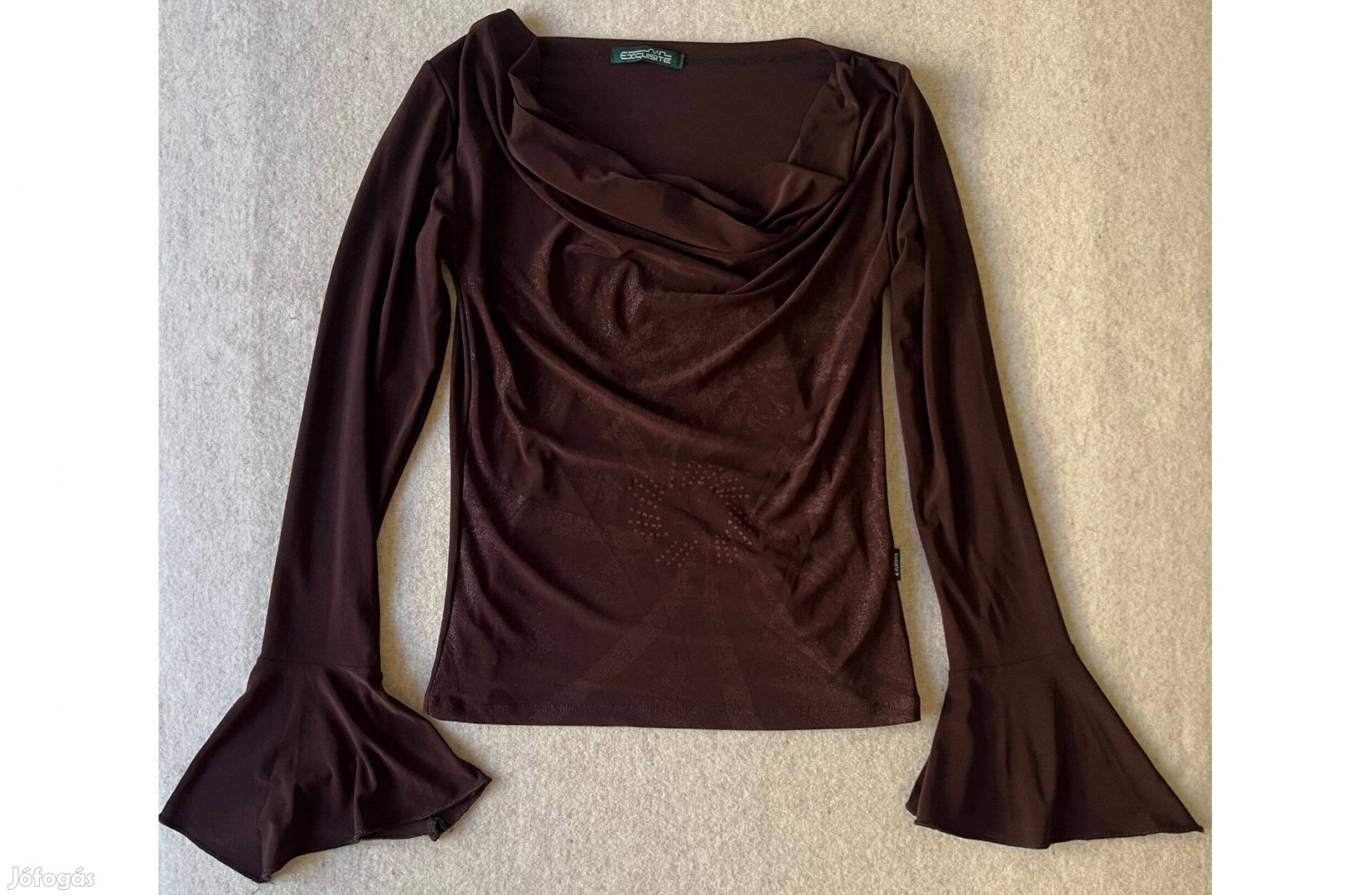 Újszerű kiváló állapotban lévő, alkalmi női felső eladó. Hosszú ujjú, ejtett nyakú, Most újra divatos tölcsér ujjú (különleges megoldás).