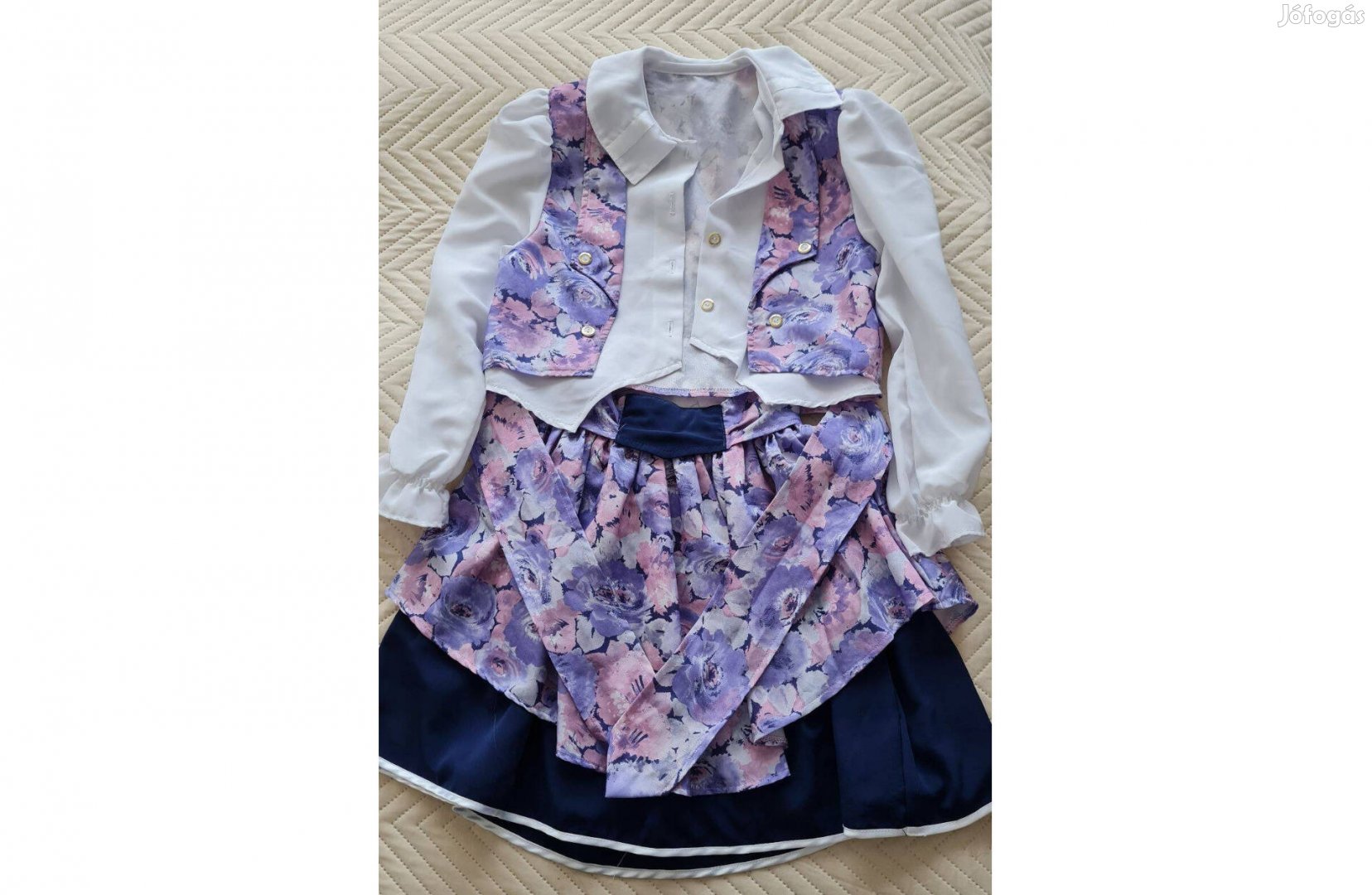 Eladó alig használt nagyon szép kislány mintás fehér selyem együttes: szoknya + hosszú ujjú felső (blúz) 132-es méret