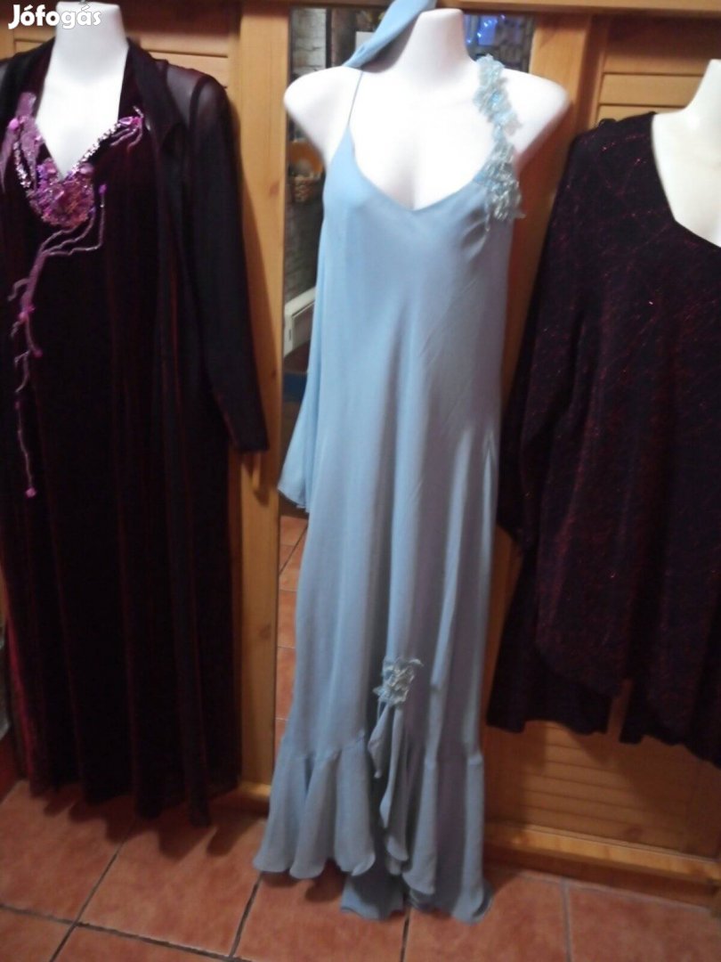 Eladó a képeken látható halvány kék, selyem, hosszú, vállpántos, gyöngyös díszítéssel sállal.Egyedi női elegáns alkalmi ruha. Méretek: 150 cm hosszú, derék 45cm, mell 50 cm.Hiba próba babán sem adják vissza szépségét!Egyszer használt esküvőn.Csak személyes kispesti átvétel próba javasolt.Ára:15.000ft Érdeklődni
