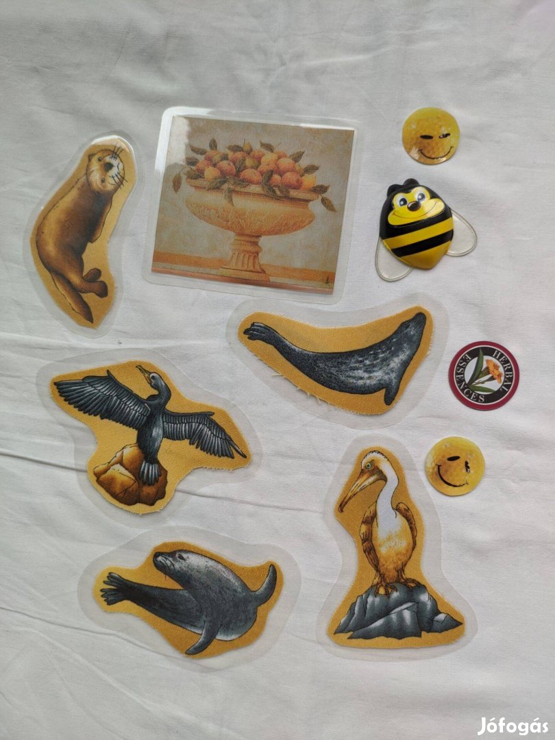állatos mágnesek (fóliázott anyagból: vidra, fóka, pelikán, madár, bálna), gyümölcsös kép, méhecskés dísz, 2 db smiley arc és virág