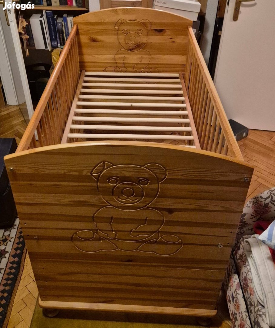 Nagyon szép állapotú, 3 magasságban állítható 140x70-es tölgyfa kiságy eladó lapra szerelten minden csavarjával.
