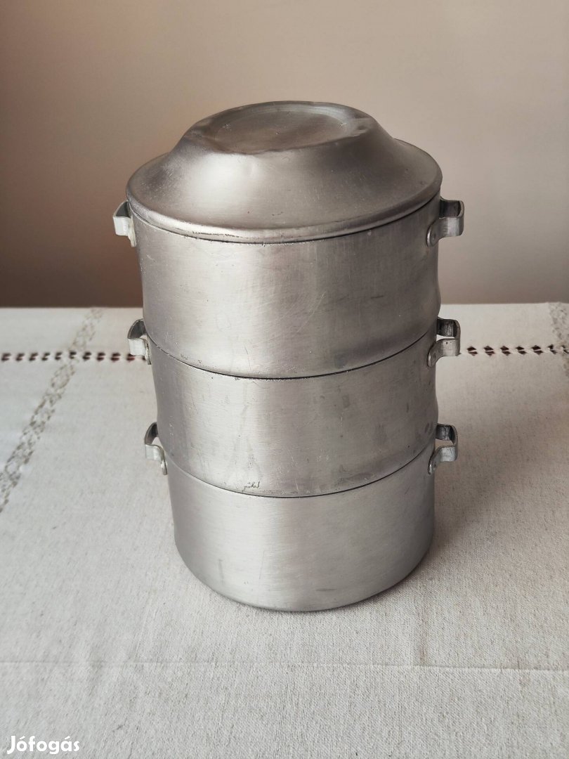 Eladó a képeken látható 3 db-os alumínium ételhordó készlet. A hordozó keret hiányzik hozzá. Pótlásnak, esetleg egyéb alternatívával használni.