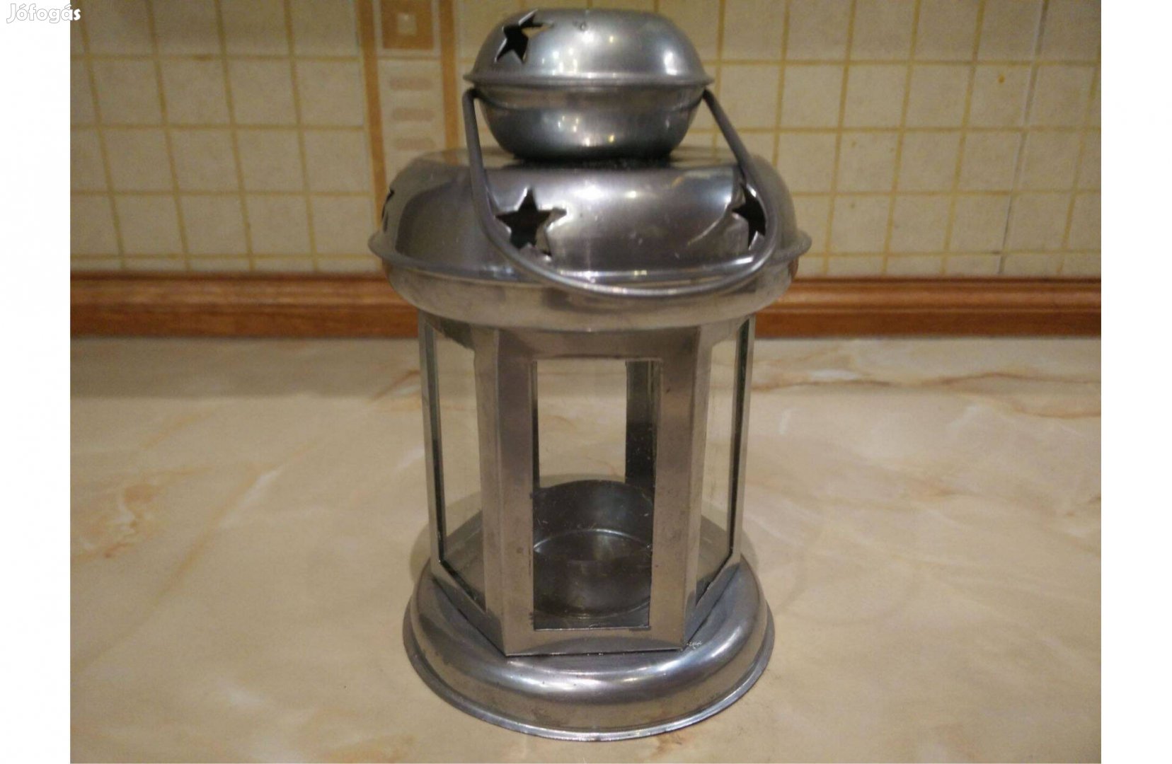 Eladó a képeken látható alulról tölthető, fölakasztható alumínium mécsestartó, oldalán kis üvegablakokkal, a tetején csillag alakú lukakkal.