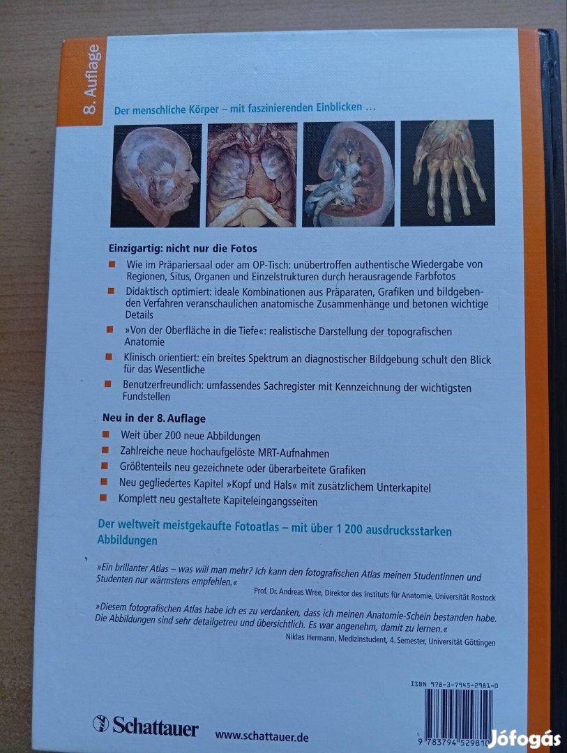 Anatómiai atlasz, gyönyörű színes fotókkal német nyelvű, orvosoknak, orvostanhallgatóknak rendkívül hasznos kihasználatlanság miatt eladó.