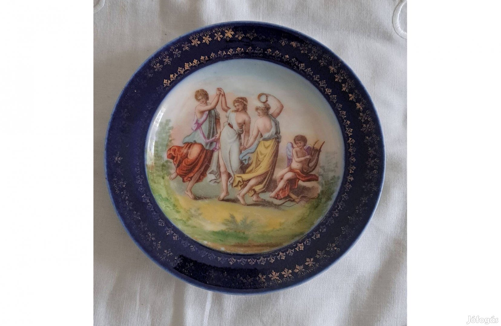 Antik Altwien és Victoria Austria kék szélű zsáner jelenetes porcelán tányér aranyozás kopottas, pótlásnak vagy gyűjteménybe kiváló. Mérete:16 cm