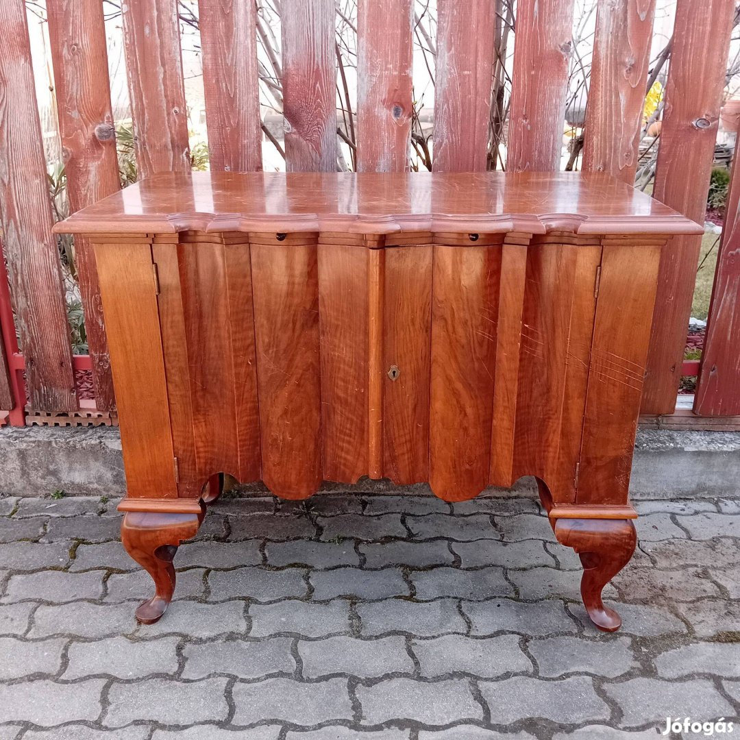 Eladó a képeken látható, ritka és rendkívül dekoratív antik biedermeier stílusú tálalószekrény. A bútor legfőbb jellegzetessége a függőlegesen tagolt, hullámos (vertikális) front kiképzés, amely a korszak egyik legkeresettebb és legigényesebb asztalosmunkája. A szekrény gyönyörű, meleg tónusú diófa borítással készült, amelynek erezete követi a hullámvonalakat. Különlegessége az elegáns, ívelt lantláb, amely stabillá, mégis könnyeddé teszi a megjelenését. A tetőlap formája szintén követi az alsó rész hullámvonalát.