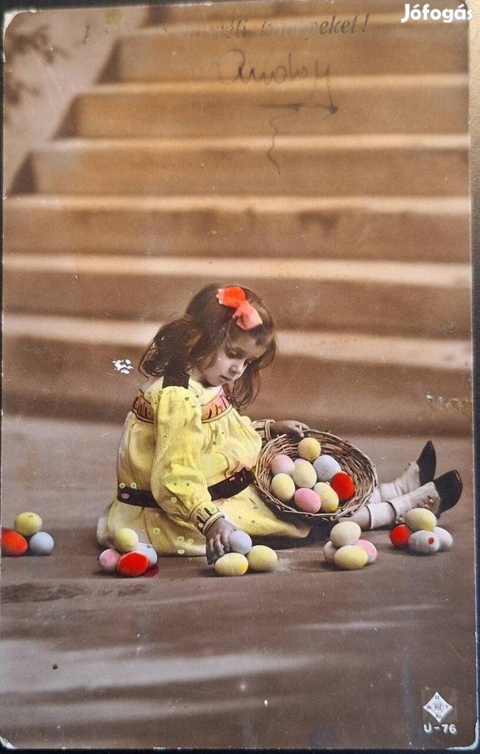 Eladó egy bájos, színezett fotó technikával készült antik húsvéti képeslap. A képen egy kislány látható kosárnyi színes tojással - igazi nosztalgikus, korabeli hangulat.