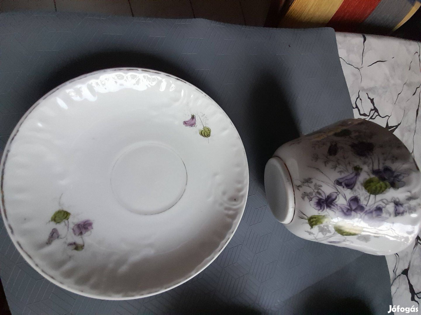 4 db ibolyamintás teás csésze és 4 db csészealj. A porcelán jelzés nélküli, de nagyon régi