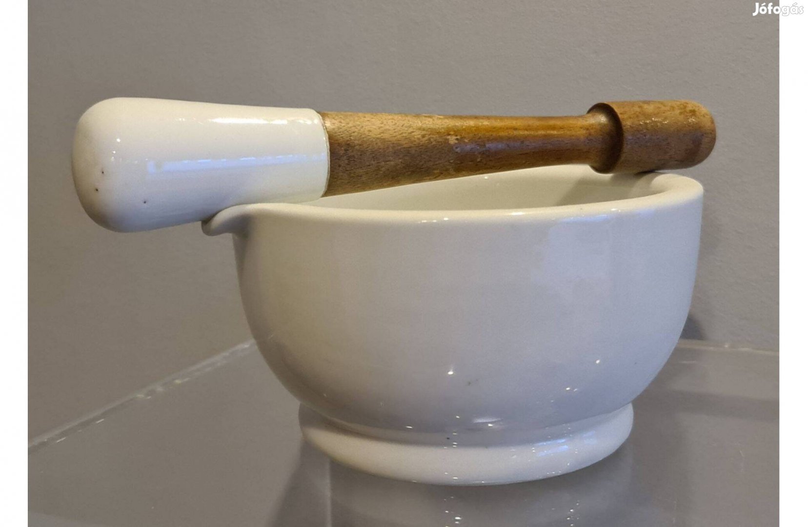 Antik, jelzett Belga porcelán (Guxard & Hagemeyer Bruxelles) csodálatos gyógyszertári patika mozsár / dörzsmozsár, fanyelű törővel eladó a megjelölt fix áron. Mozsár átmérője: 18,5 cm, magassága: 10 cm. Fanyelű törő hosszúsága: 26 cm. Posta vevő terhére megoldható (küldés nagyon gondosan csomagolva)