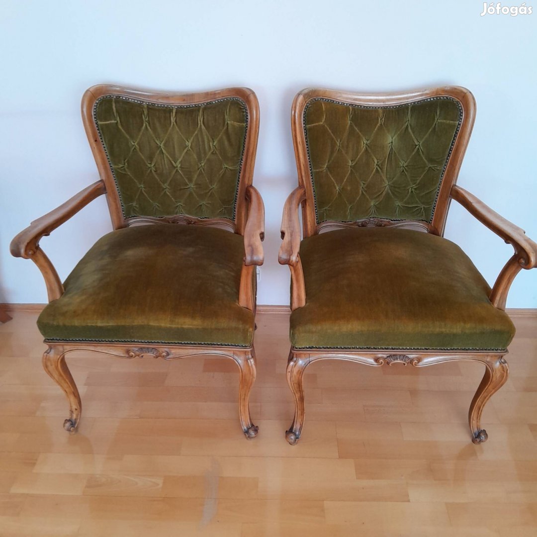 A képen látható,zöld plüss huzatú,antik,barokk fotelok jó állapotban eladók.2 db.együtt