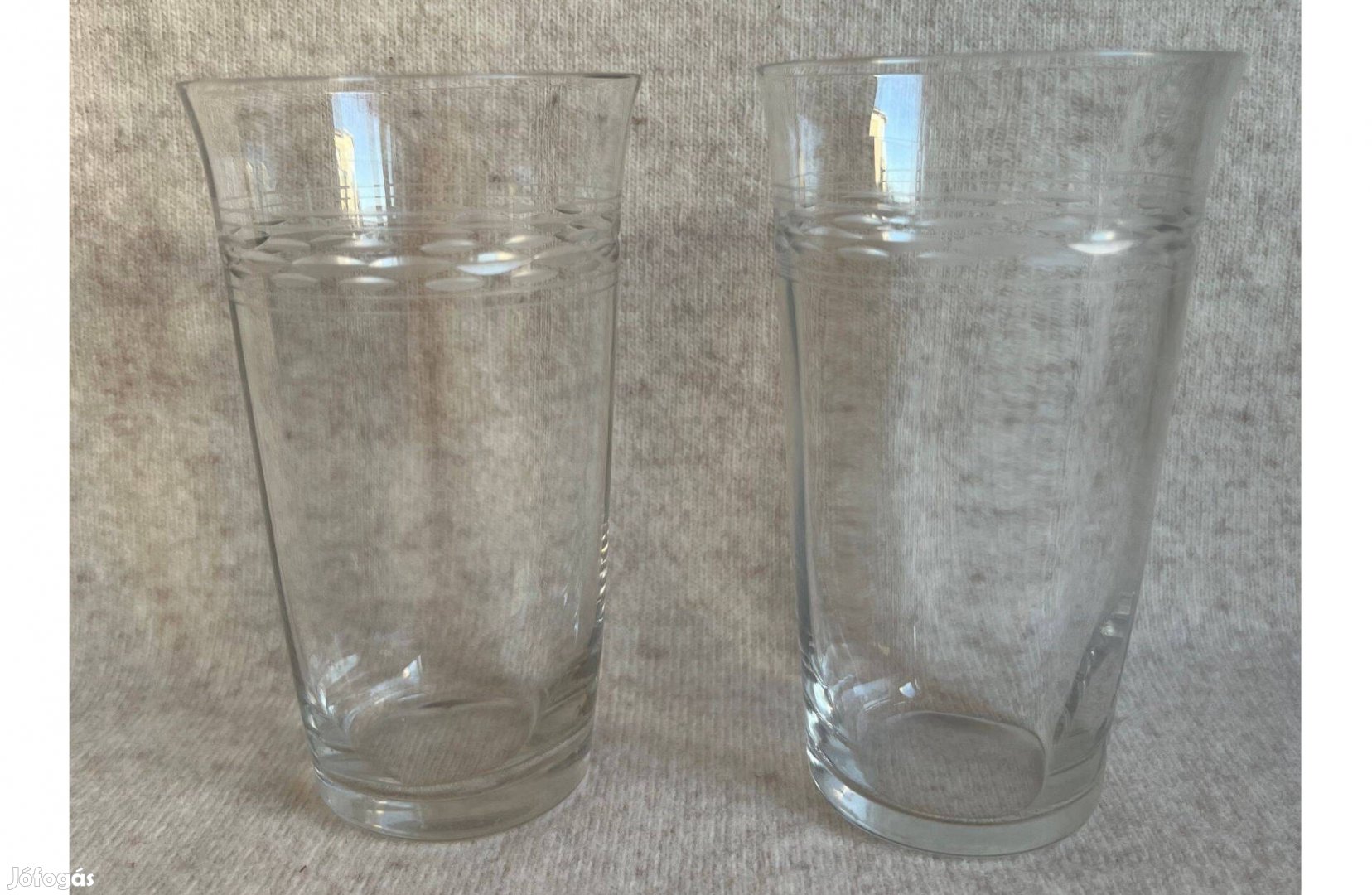 Kiváló állapotban lévő, boros pohár pár eladó. Gyűjtőknek, igényes háziasszonyoknak, hiányos készletbe. Régi cca két decis, oldalán csiszolt vonaldíszítéses, széles szájú, vékony falú boros pohár.