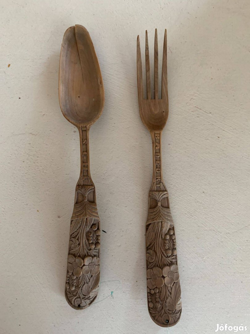 Antik jellegű, kézzel faragott fa evőeszköz Lourdes és Ischl felirattal