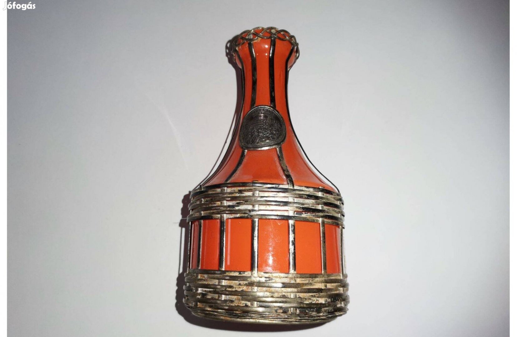 Német fémkeretes antik narancssárga üvegváza,Heidelberg Schloss várkastély címerrel, hibátlan szép állapot.