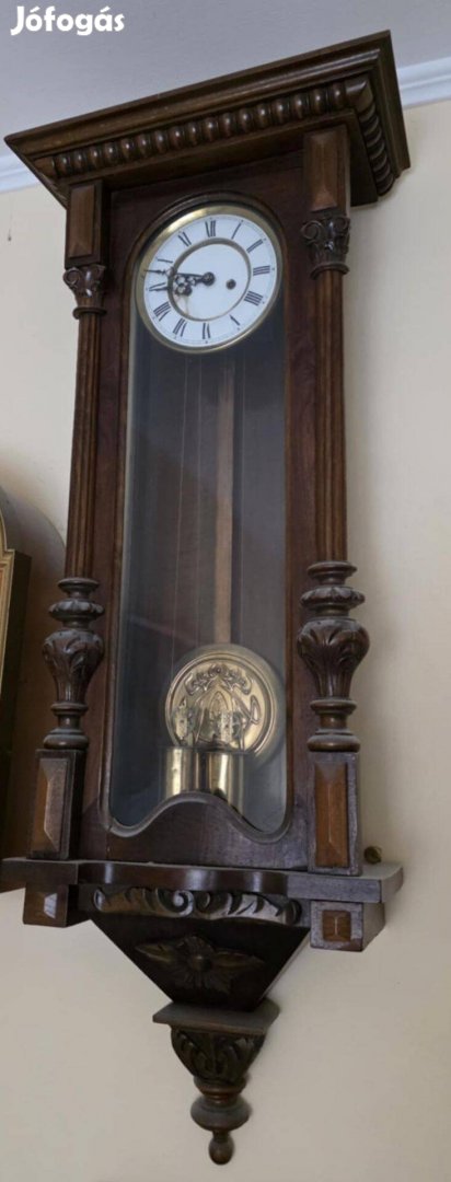 Eladó a képeken látható, patinás megjelenésű, sötétbarna fa tokos, kétingás falióra. Stílusát tekintve a századfordulós bécsi barokk / altdeutsch hangulatot idézi, esztergált oszlopokkal és díszes faragásokkal.