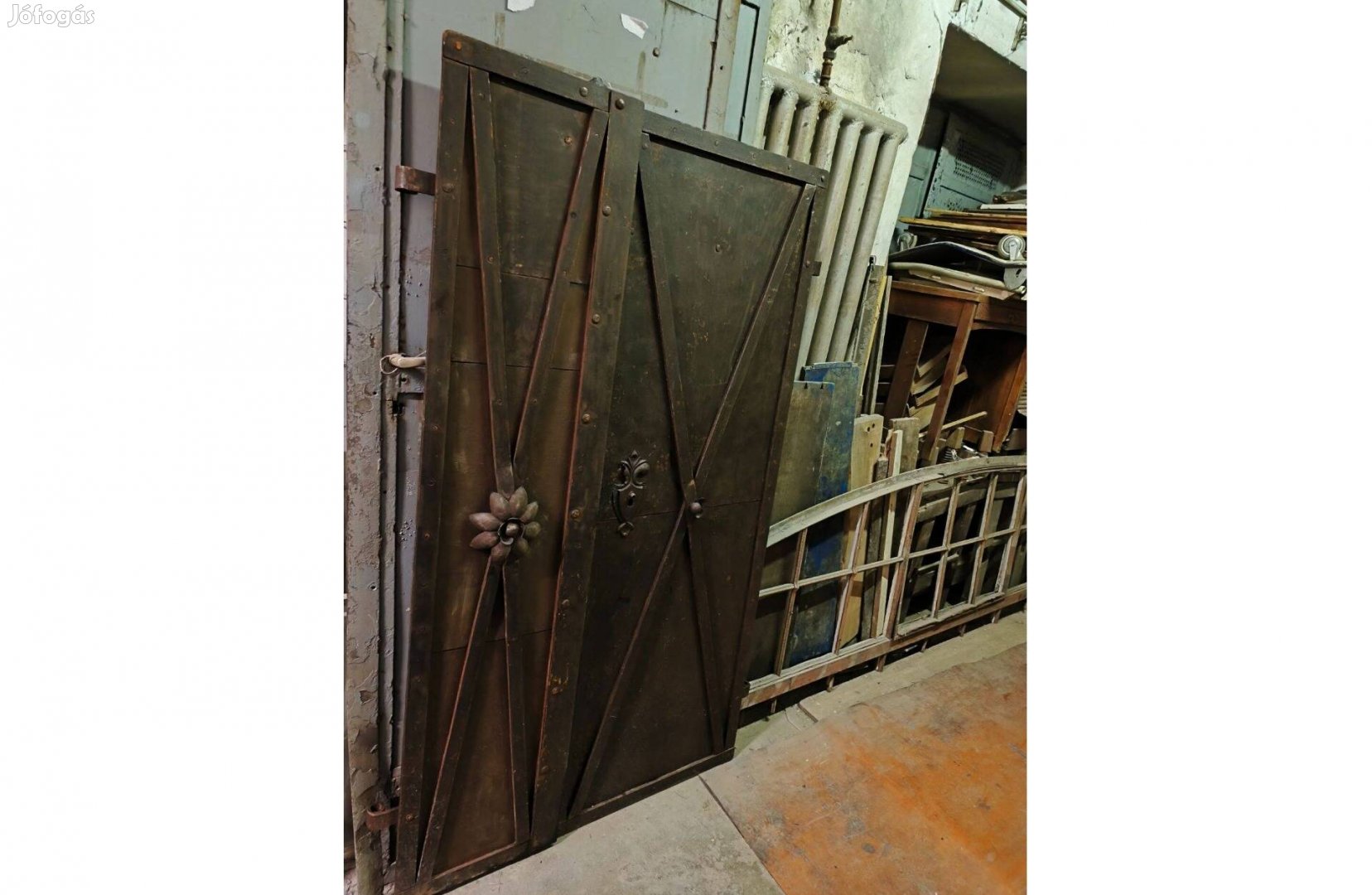 Eladó a képeken látható 18. század végi, 19. század elejei kovácsolt antik ajtó. Régebben festett volt, de a festék le lett szedve róla. Most egy szép patinás felületű jó méretű ajtó. Kulcs sajnos nincs meg hozzá, de lehet még készíttetni. Méret szempontjából nem szimmetrikus, igaz kétszárnyú, de az egyik oldala a bal az 40 cm széles, jobb oldala 60 cm. Van egy viszonylak széles takaró fém a két ajtó között, ezzel egy kicsit lehet játszani a szélességgel (ha egy kicsit nagyobbra van szükség, akkor 1-2 cm még van benne...Magassága 180 cm. Rögzítők, zsanér megvan hozzá, szép masszív darab. Ára: 199.990.-