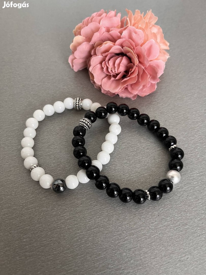 Eladó anya-lánya fehér és fekete ónix ásványkarkötő.Rugalmas damilon,16-18 cm