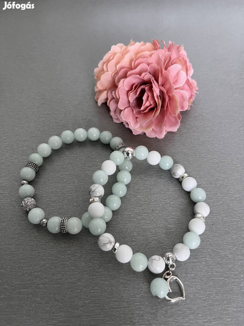 Eladó anya-lánya zöld kalcedon,fehér howlit,matt ónix és ezüst hematit ásványkarkötő.Egyik karkötőn szivecskés charm van a másikon cirkon köves köztes.Rugalmas damilon,16-18 cm.