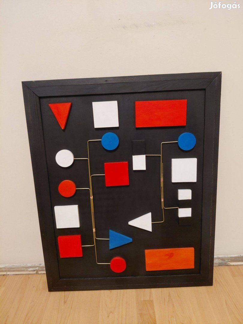 Áramkörök fa dombormű ,rétegeltfa és sárga réz . Ez egy geometrikus absztrakt szobor vagy dombormű, amely különböző formákat és színeket használ.