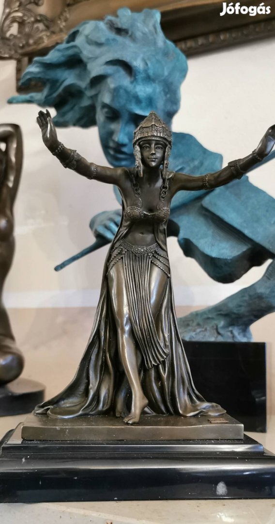 Ez a kivételes, Art Deco hangulatú alkotás egy egzotikus táncosnőt vagy harcosnőt ábrázol, emelt karokkal és részletgazdag fejfedővel és öltözékkel. Az 1920-as, 30-as évek eleganciáját idéző, csodálatosan megmunkált bronz darab magán viseli az időtlen szépség jegyeit, ahol a lendületes póz és a drapériák finom kidolgozása a korszak mestereinek munkáját dicséri. A valódi, patinázott bronz mélységet és karaktert kölcsönöz a tárgynak, amelyet egy elegáns, fekete márvány talapzat emel ki, hangsúlyozva a szobor meleg tónusait. A szobor méretei a következők: 26 cm magas, 16 cm széles és 20 cm hosszú (márvány talpazattal együtt). A darab hibátlan, tökéletes gyűjtői állapotban van, így ideális választás Art Deco gyűjtőknek, művészetkedvelőknek és mindazoknak, akik egy valódi, szemet gyönyörködtető fókuszpontot keresnek otthonukba, irodájukba vagy elegáns üzletükbe.