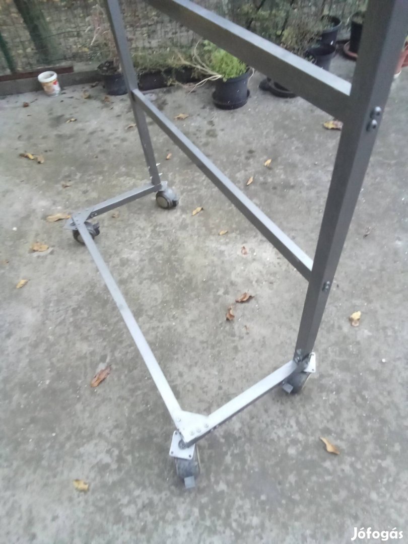Bolt felszámolás, kihasználatlanság miatt eladóvá vált a képeken is látható áru bemutató gurulós,fékezhető álvány és a hozzá tartozó akasztók. Rengeteg mindenre használható ( ?,ruha,dísztasak, stb...) 1 akasztóra minimum 7 dolog akasztható. Kb 15 akasztó van hozzá,ami 5 sorba osztható fel.
