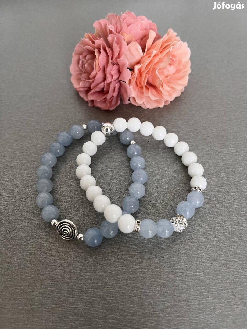 Eladó Anya -lánya ásványkarkötő akvamarin,fehér ónix és ezüst hematitból.Rugalmas damilon,16-18 cm
