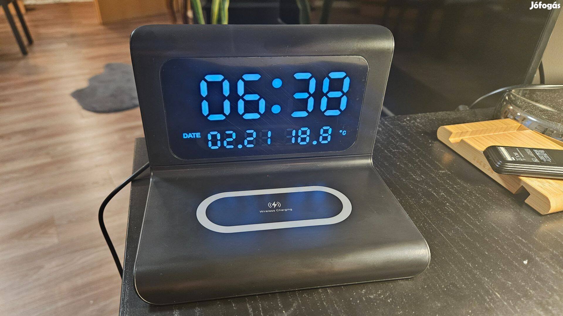 Eladó a képeken látható új asztali óra és mobiltelefon töltő szerkezet (wireless). Óra, dátum, hőmérséklet és ébresztő funkcióval, USB - C kábelről működik, nincs elemes üzemmódja.