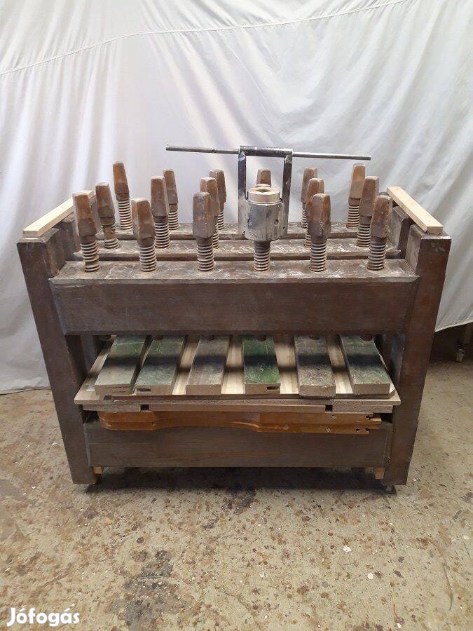 Nyugdíjazás miatt, műhelyfelszámolásból enyvezőbak eladó. Elsősorban bútorrestaurátoroknak, bútorfelújítóknak ajánlom Az 1800-as évekből származó, fa spindlikkel. Használható, jó állapotban. 110 cm X 60 cm-es felület ragasztható. A mérete: 110 cm magas, 130 cm széles és 60 cm mély. Bolygókerekeken gurítható.