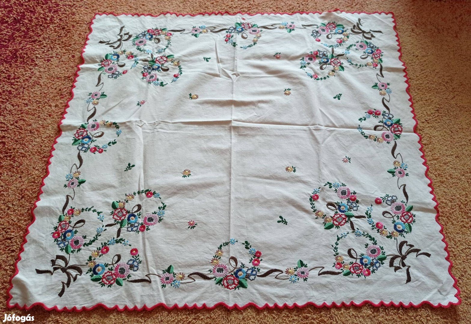 Mérete: 80 cm x 85 cmA terítő szélén körben piros bordűr van hullám alakban hímezve, ami egyben a textília szegése is.