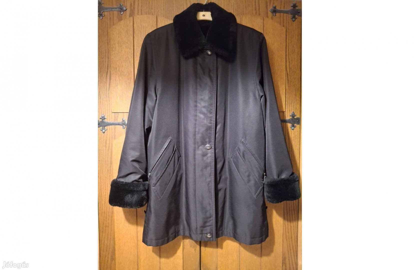 Fekete kabát (kivehető bélés) L- XL- es méret; vállszélesség 45 cm, hossza: 90 cm, válltól mért hossz: 80 cm, hónalj alatt mért szélesség: 55 cm, bundás belső kivehető (gombokkal van rögzítve), így könnyen mosható, átmeneti és téli kabátnak is hordható, színes sál jól mutat a feketén, eladó: 5000,-Ft -ért, személyesen átvehető, Bp. III., Békásmegyeren, kérésre postázom is megbeszélés szerint.
