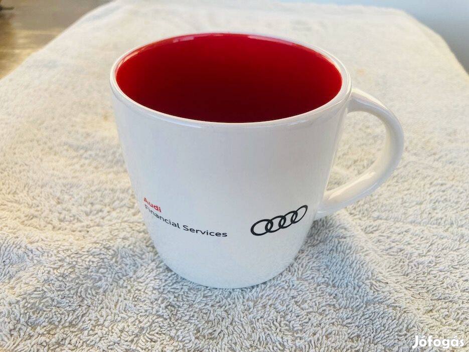 Audi fehér porcelán bögre, a belseje piros színű. A bögre elején az Audi logó van. Mosogatógépben mosható. Eredeti német gyári termék. Vadonatúj!