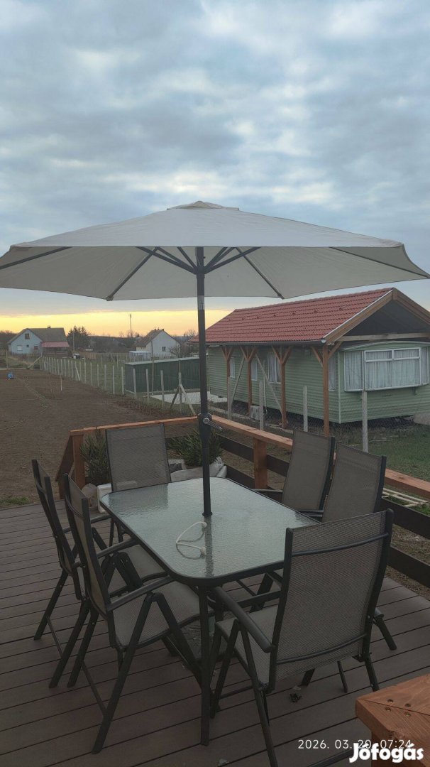 3 alkalommal kinyitott szinte új, 270cm átmérőjű minőségi napernyő olcsón eladó. hibátlan állapotú, dönthető, két részre szedhető. A talp nem tartozéka. tel. nulla-hat 205020608