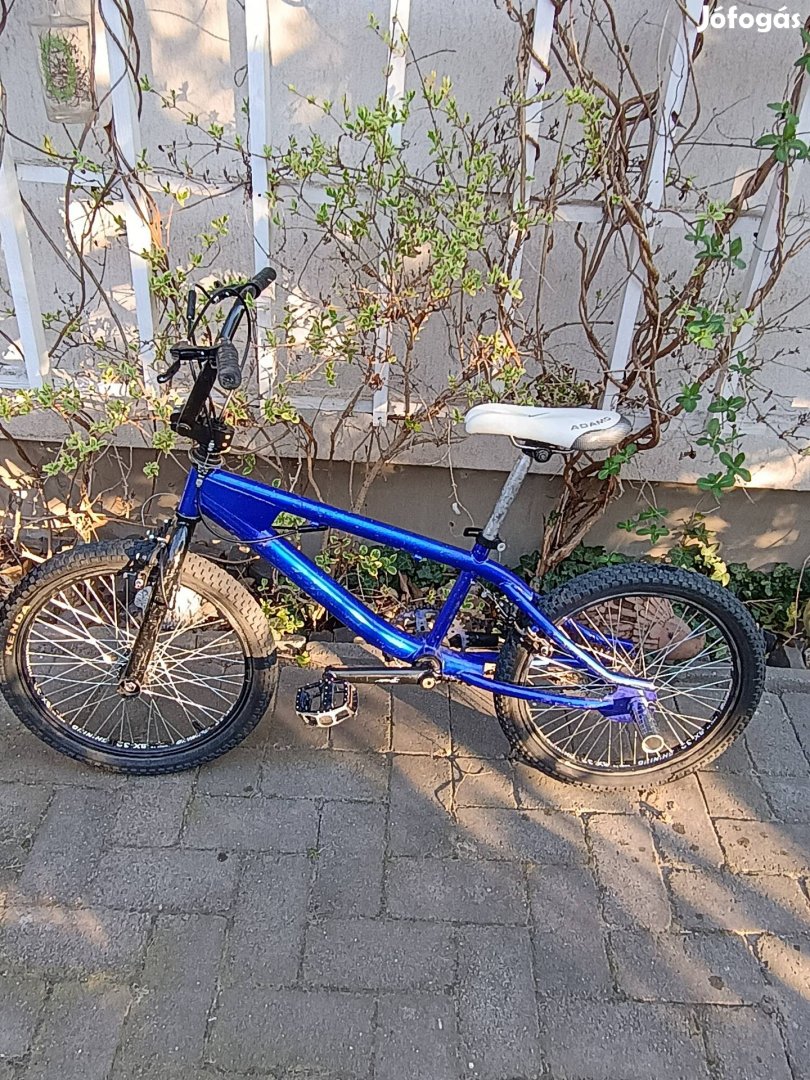 Egyedi, épített bmx kékes-lila metál színben. Masszív váz, jó gumik, pattogóval, körbefordítható kormánnyal. Használt, de jó állapotú.