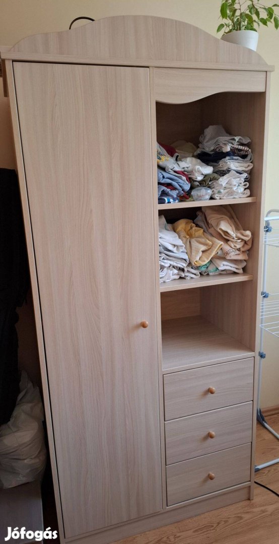 Bababútor szett eladó! Újpesti címről vihető! 3 részből áll. Ágy 70×140-es (külső méretei: 143,5cm hosszú, 73,5cm széles, pelenkázó komód: 87cm széles, 73cm mély. Szekrény: 181cm magas, 87cm széles és 50cm mély.