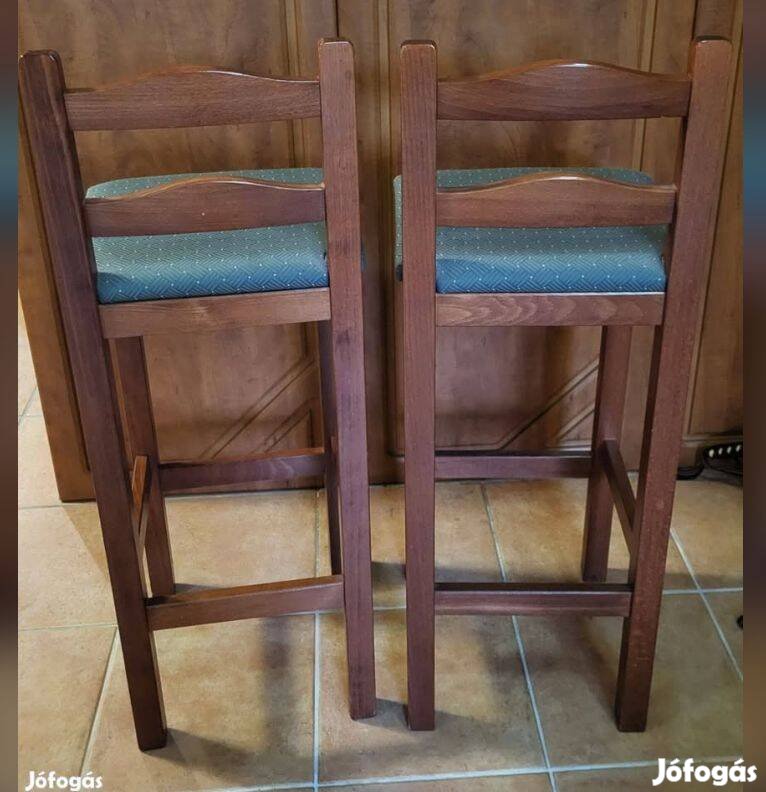 Eladó 2 db masszív fa bárszék zöld, kárpitozott ülőfelülettel.