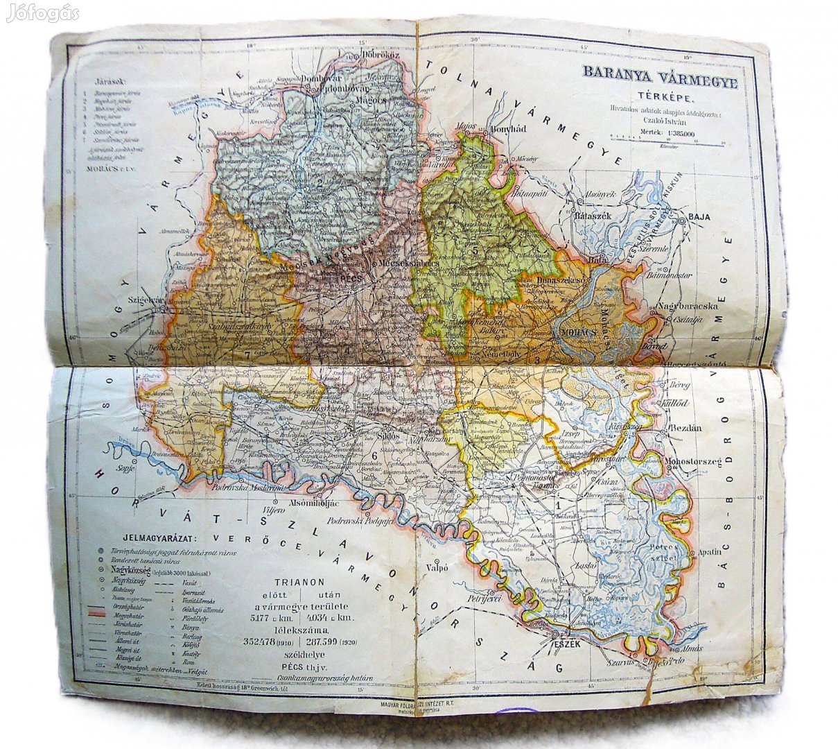 Baranya Vármegye régi térkép 1920. Hivatalos adatok alapján átdolgozta: Czakó István. Mérték lépték: 1 : 385.000. Méret: 32 x 29 cm. Szakadt, ragasztott.