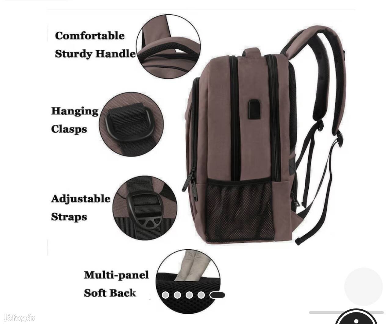 Barna utazó hátizsák sok rekesszel és zsebbel, USB csatlakozási lehetőséggel.