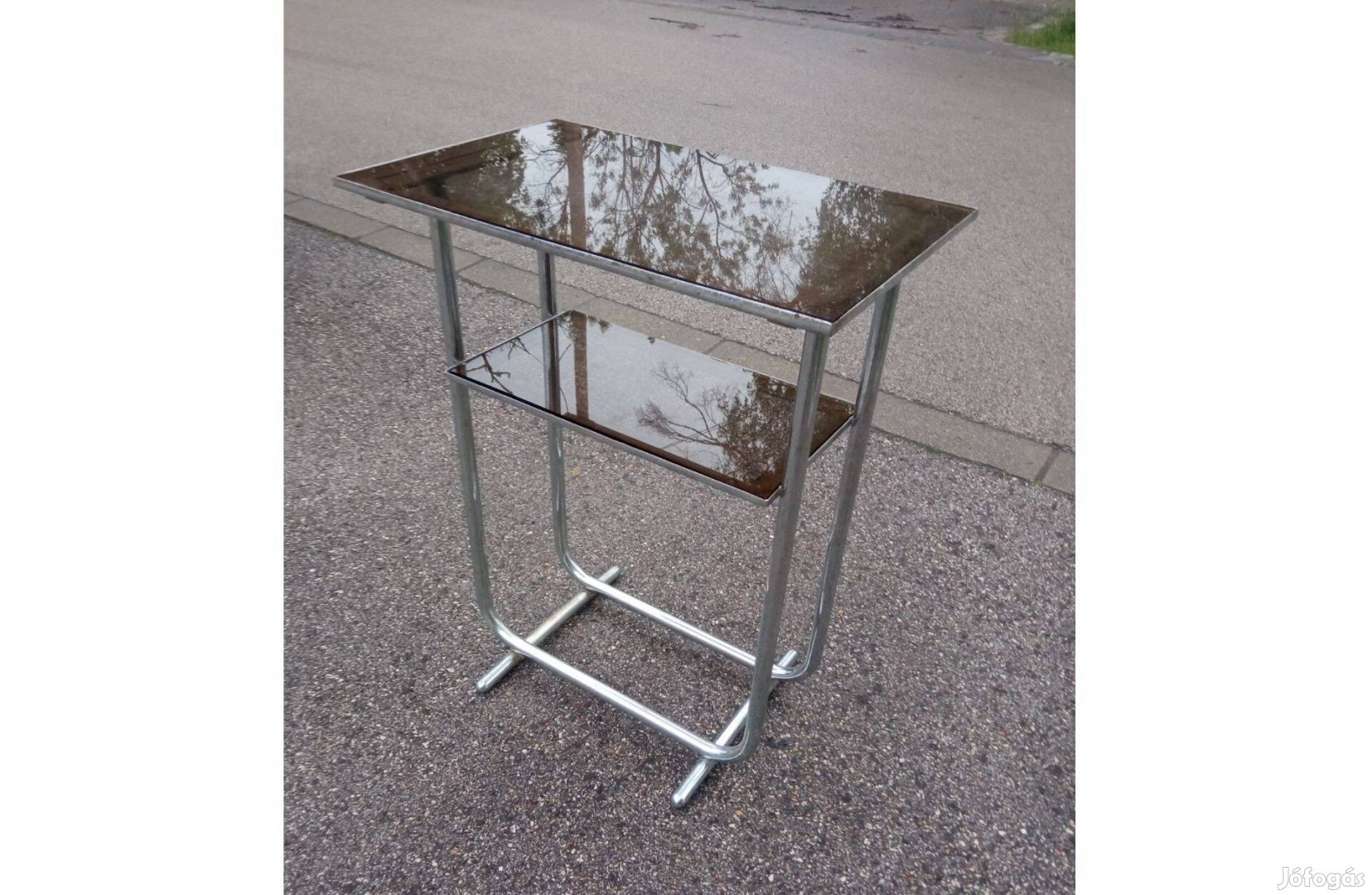 Kifejezetten jó állapotban megőrzött, krómozott acélvázas keskeny lerakó asztalka, állvány az 1930-40-es évekből.