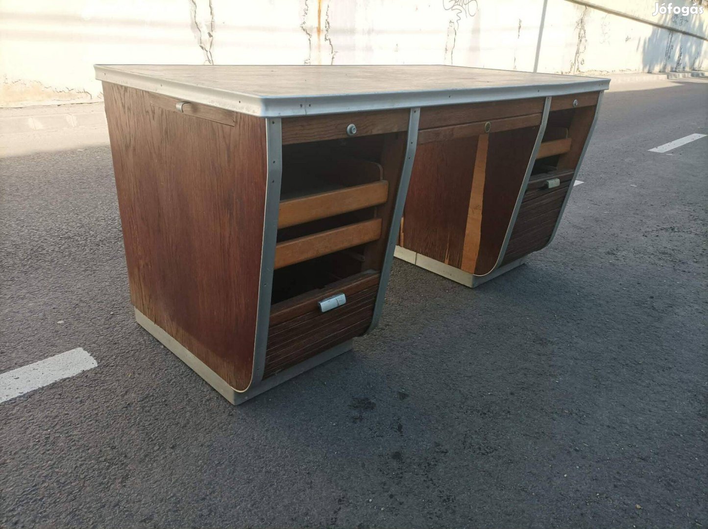 Az éleken végigfutó fémszegélyek nemcsak esztétikai szerepet töltenek be, hanem védik is a bútor éleit a kopástól. Állapota felújítandó, nagyméretű, de szállításban tudok segíteni. Átvehető XVI. kerületben.