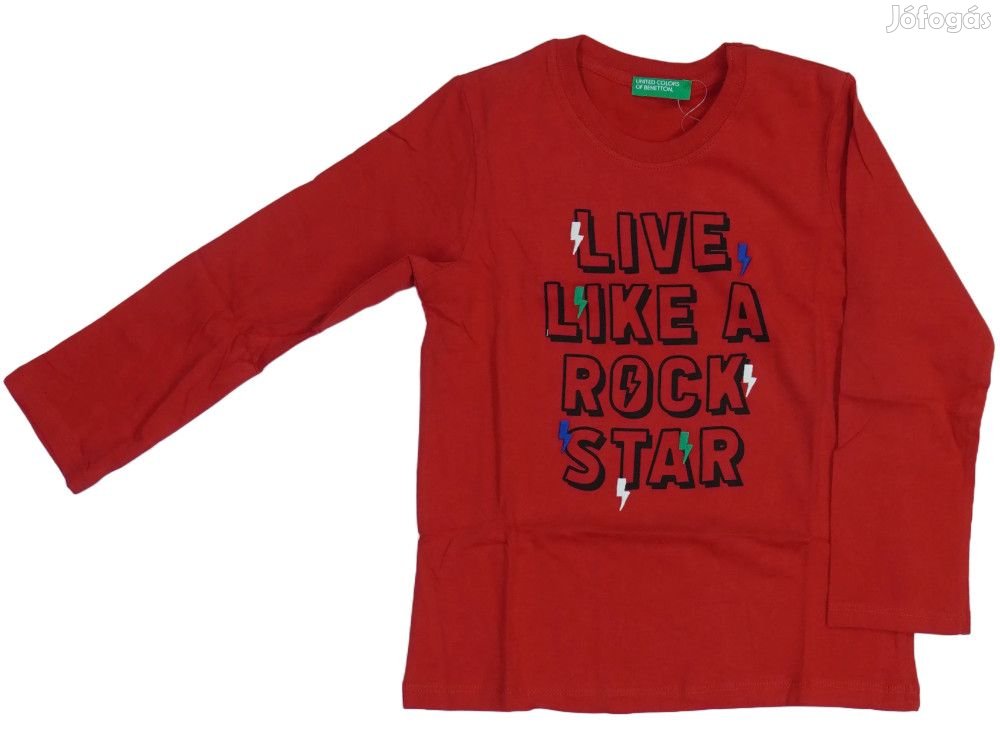 Piros színű hosszú ujjú felső fiúknak, mely kényelmes pamut anyagból készült. A ruhadarab elején nagy, feltűnő 'LIVE LIKE A ROCK STAR' felirat található fekete betűkkel, melyet színes díszítő elemek - villám motívumok és színes akcentusok - egészítenek ki. A póló környakú kialakítású, hosszú ujjú és normál hosszúságú. Ideális mindennapi viseletre, különösen azoknak a fiúknak, akik szeretik a zenét és a rock stílust. A Benetton márka minőségi kivitelezése garantálja a tartósságot és a kényelmet.