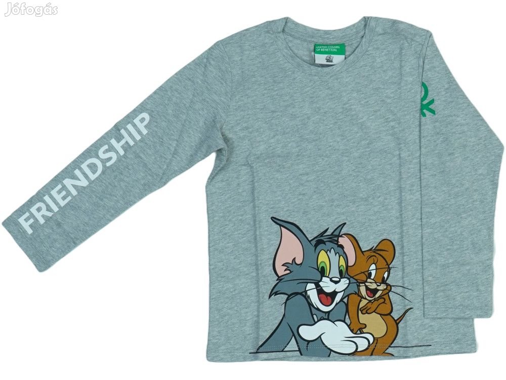 Szürke melange hosszú ujjú felső Tom és Jerry mesefigurákkal. A póló elején a két híres rajzfilmfigura, Tom macska és Jerry egér látható ölelkezve, mosolygós arccal. A bal ujjon 'FRIENDSHIP' felirat olvasható fehér betűkkel, míg a jobb ujjon egy zöld elem díszíti. A ruhadarab kényelmes, puha anyagból készült, környakú kialakítással. Ideális választás kisfiúknak, akik szeretik a klasszikus rajzfilmfigurákat és a barátság témáját.