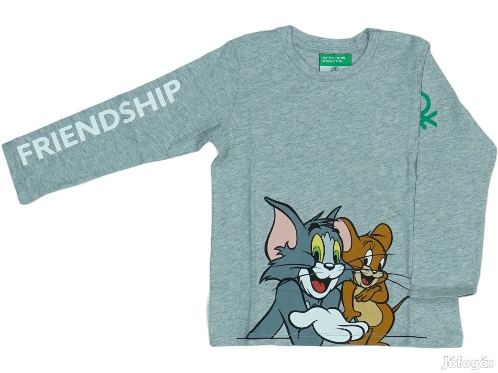 Szürke melange hosszú ujjú felső Tom és Jerry mesefigurákkal. A póló elején a két híres rajzfilmfigura, Tom macska és Jerry egér látható ölelkezve, mosolygós arccal. A bal ujjon 'FRIENDSHIP' felirat olvasható fehér betűkkel, míg a jobb ujjon egy zöld elem díszíti. A ruhadarab kényelmes, puha anyagból készült, környakú kialakítással. Ideális választás kisfiúknak, akik szeretik a klasszikus rajzfilmfigurákat és a barátság témáját.