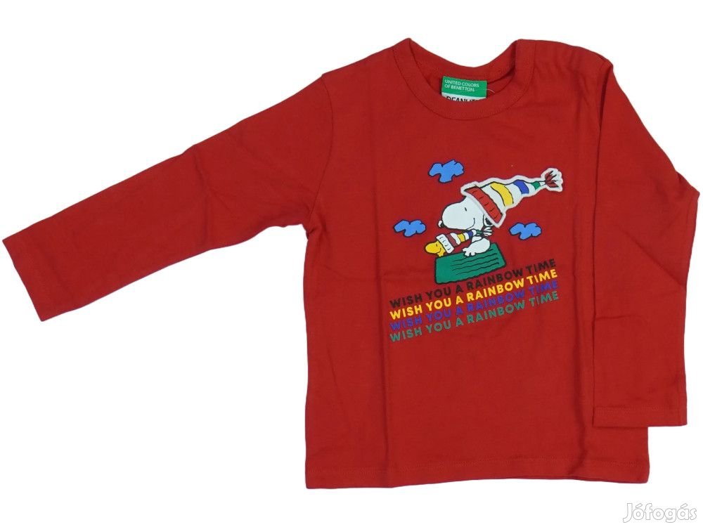 Piros színű hosszú ujjú gyerekfelső Snoopy karakter mintával. A póló elején Snoopy figura látható szivárvány színű sapkában, repülő doggal egy zöld háztetőn. Kék felhők és 'WISH YOU A RAINBOW TIME' felirat díszíti színes betűkkel (sárga, kék, lila, zöld). A United Colors of Benetton márka minőségi pamut anyagból készült, környakú, normál hosszúságú modell. Puha, kényelmes viselet mindennapi használatra, játékhoz és szabadidős tevékenységekhez. A vidám, színes Snoopy minta kedvelt lehet a gyerekek körében.