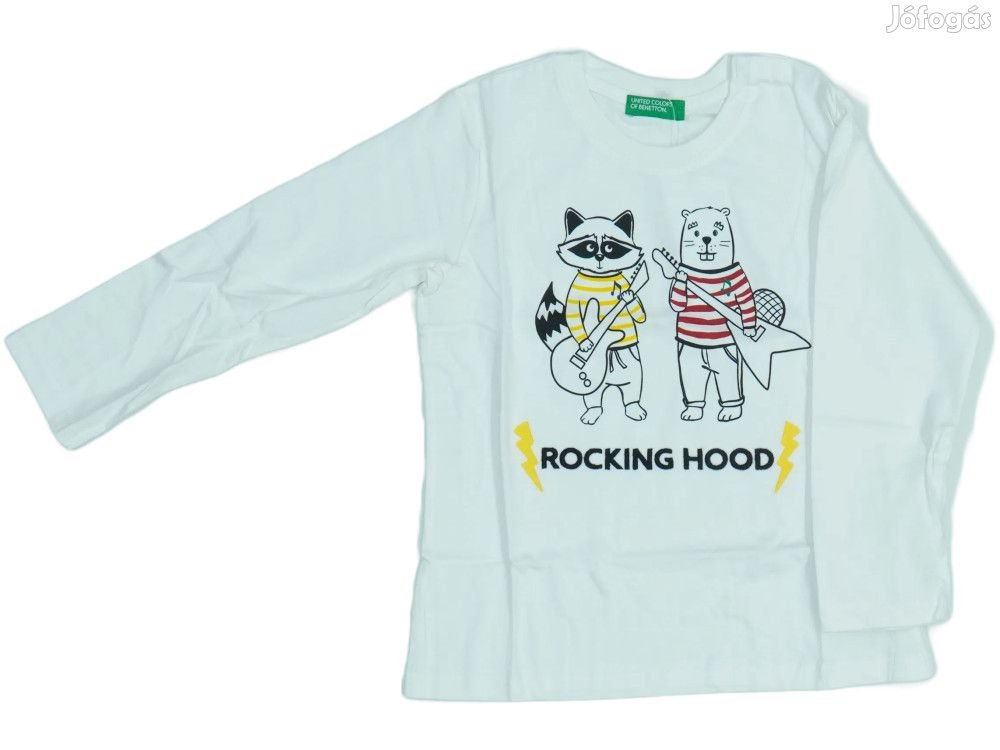 Fehér színű hosszú ujjú gyerek felső különleges rockos állat mintával. A póló elején egy mosómedve gitáros és egy csíkos macska szuperhős látható, alattuk 'ROCKING HOOD' felirattal és sárga villám motívumokkal. A ruhadarab kényelmes viselet mindennapi használatra, puha anyagából adódóan ideális játékhoz és mozgáshoz. A környakú kialakítás és a hosszú ujjak praktikus védelmet nyújtanak.