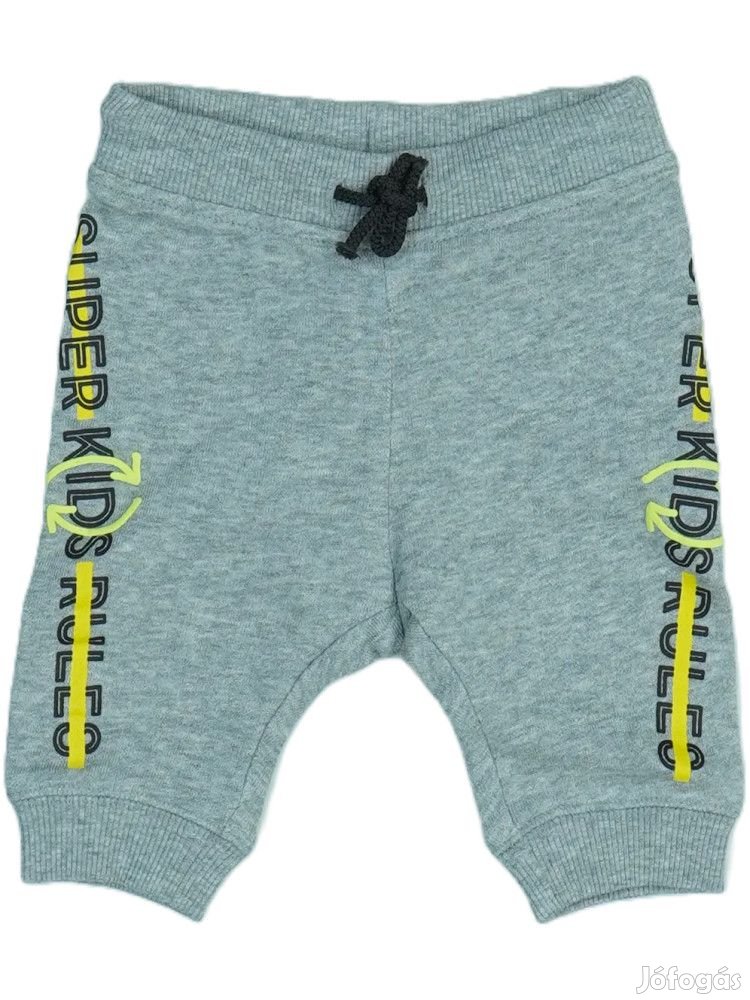 Modern fiú melegítőnadrág színes részletekkel és feliratos dizájnnal. A nadrág kényelmes gumis derékrésszel rendelkezik, amelyet húzózsinór díszít. Az oldalán 'SUPER KIDS RULES' felirat fut végig. A lábszár végét bordázott kötött szegély zárja, a hátoldalon praktikus zseb található. Sportos és kényelmes viselet mindennapi használatra, kiváló minőségű anyagból készült.